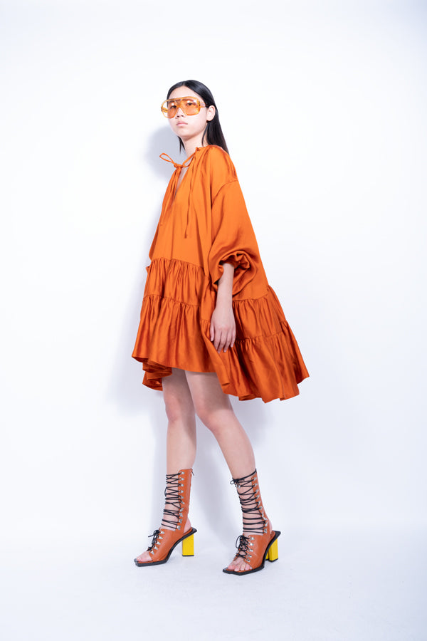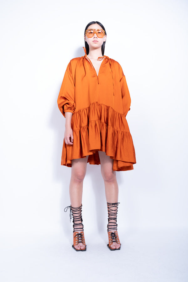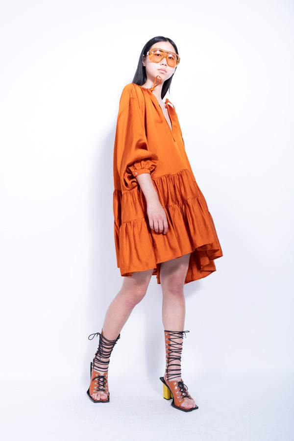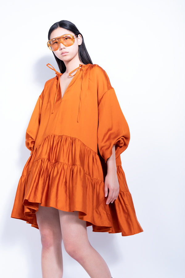 Soft, linen satin molded into a orange dress with voluminous tiers, featuring a V-open neckline tied at the collar, long tufted sleeves with a raglan cut, and a frayed hem.