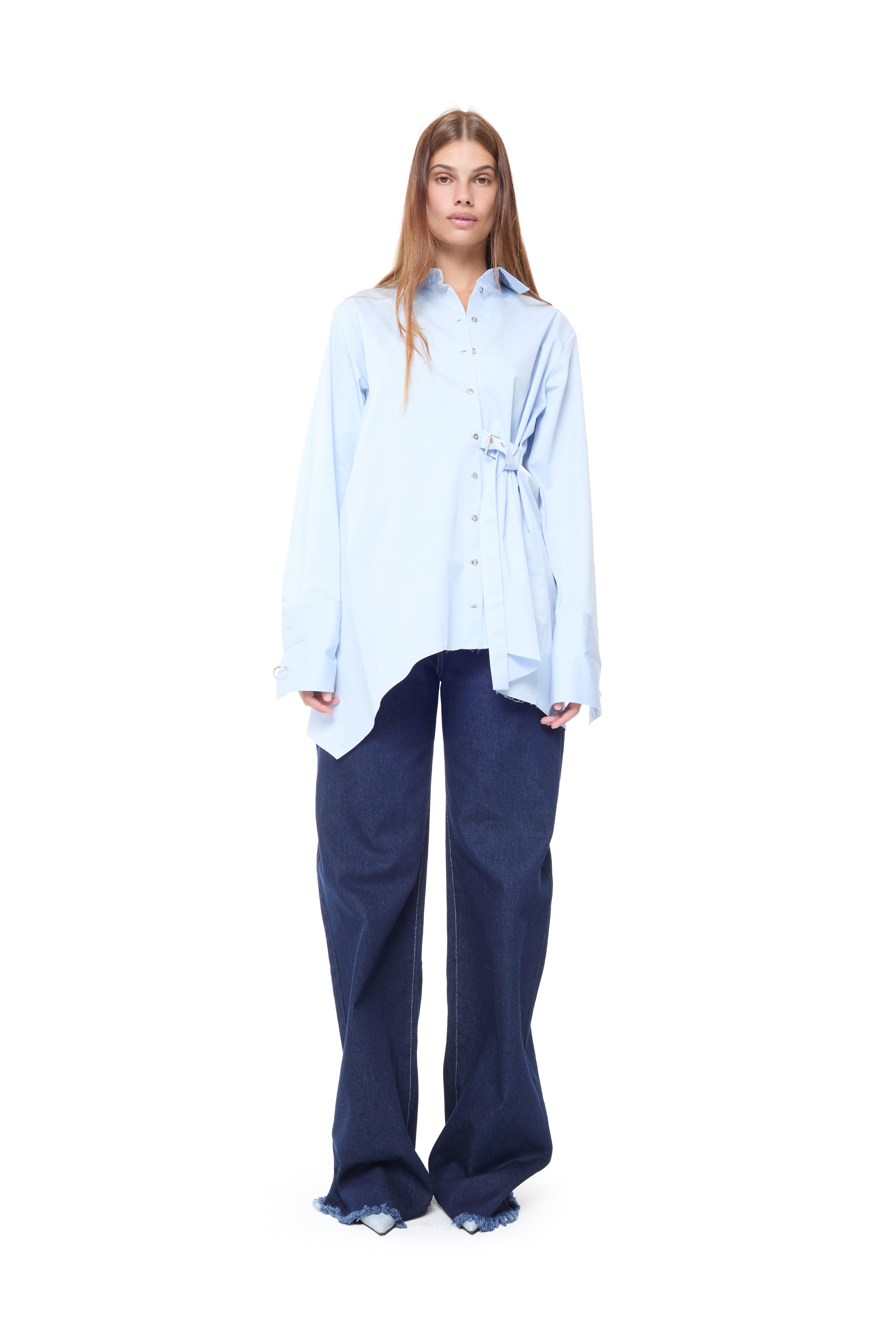 This blue organic cotton shirt stands out with its asymmetric cut and metal ring cuff details. Front buttons and side buckle fastening create distinctive styling, while long sleeves deliver versatile wear. Sustainably crafted for those who value both design innovation and conscious fashion choices.