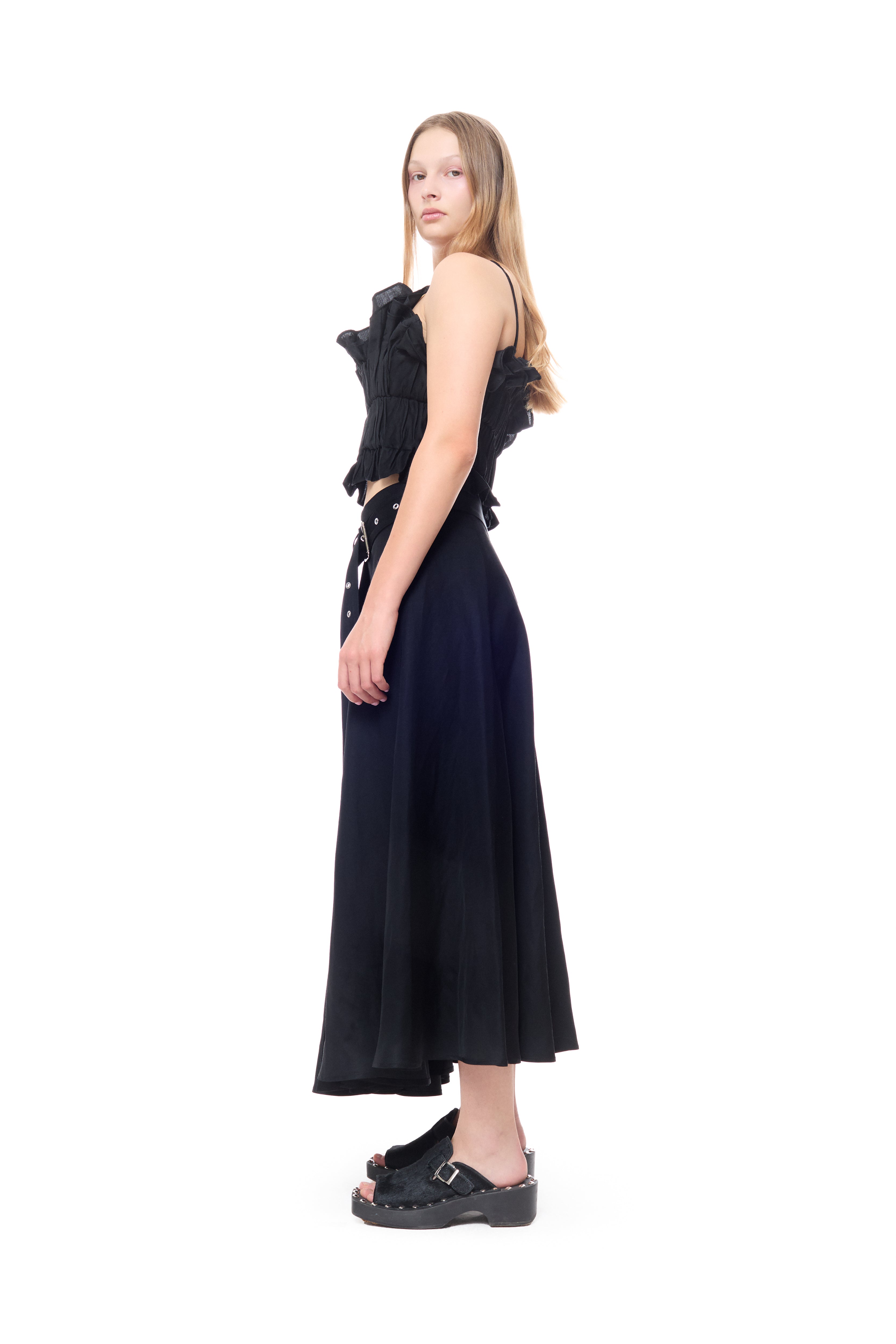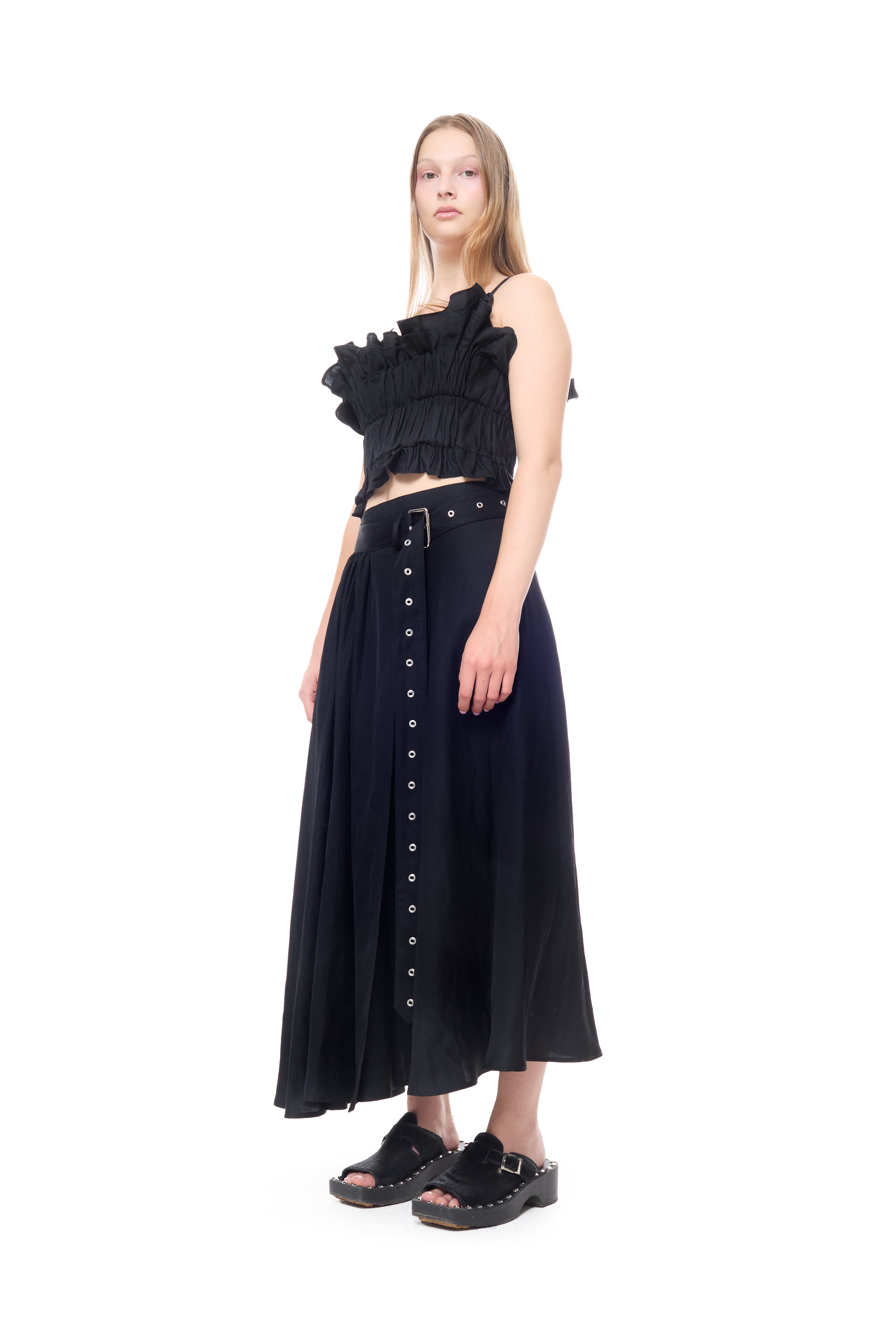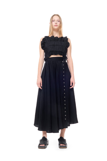 BLACK LINEN GATHERED WRAP MIDI SKIRT