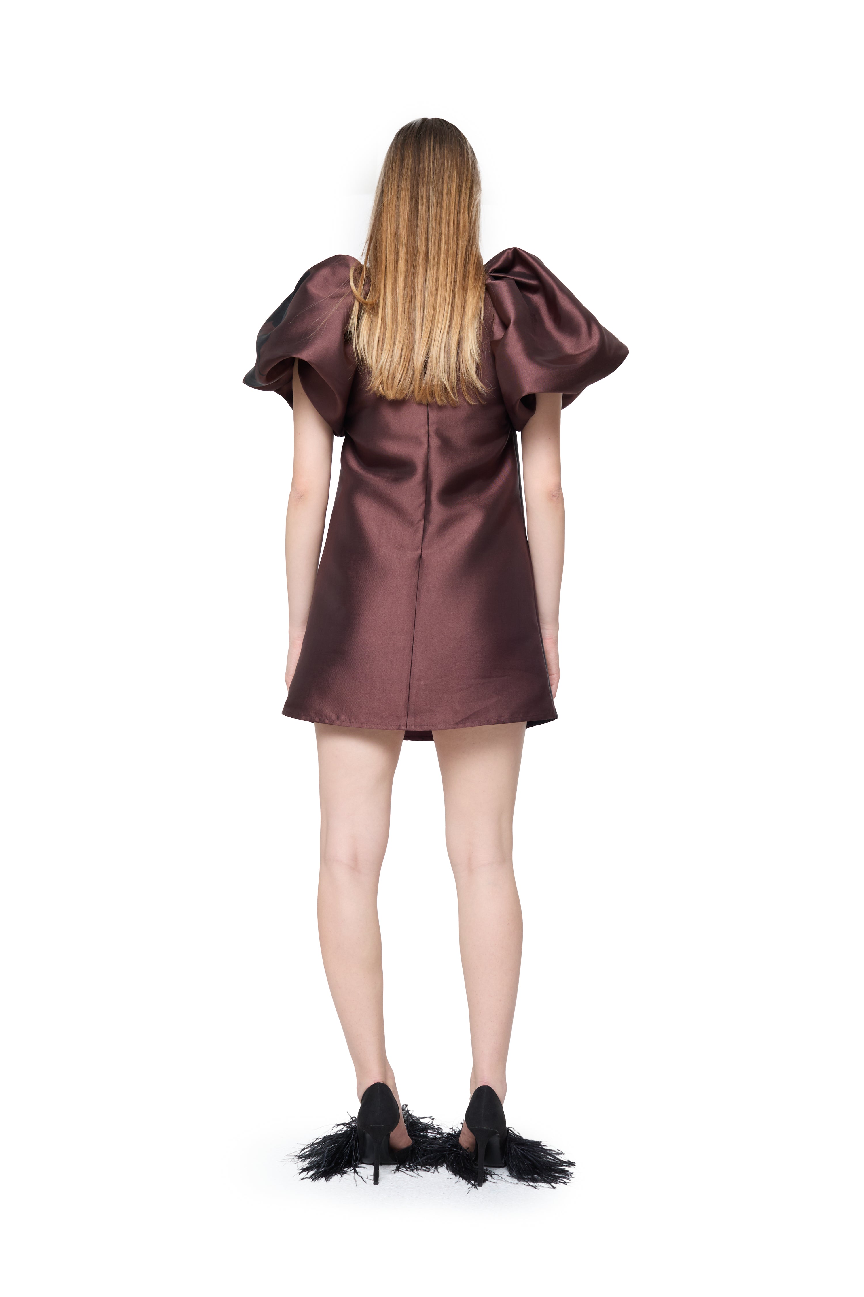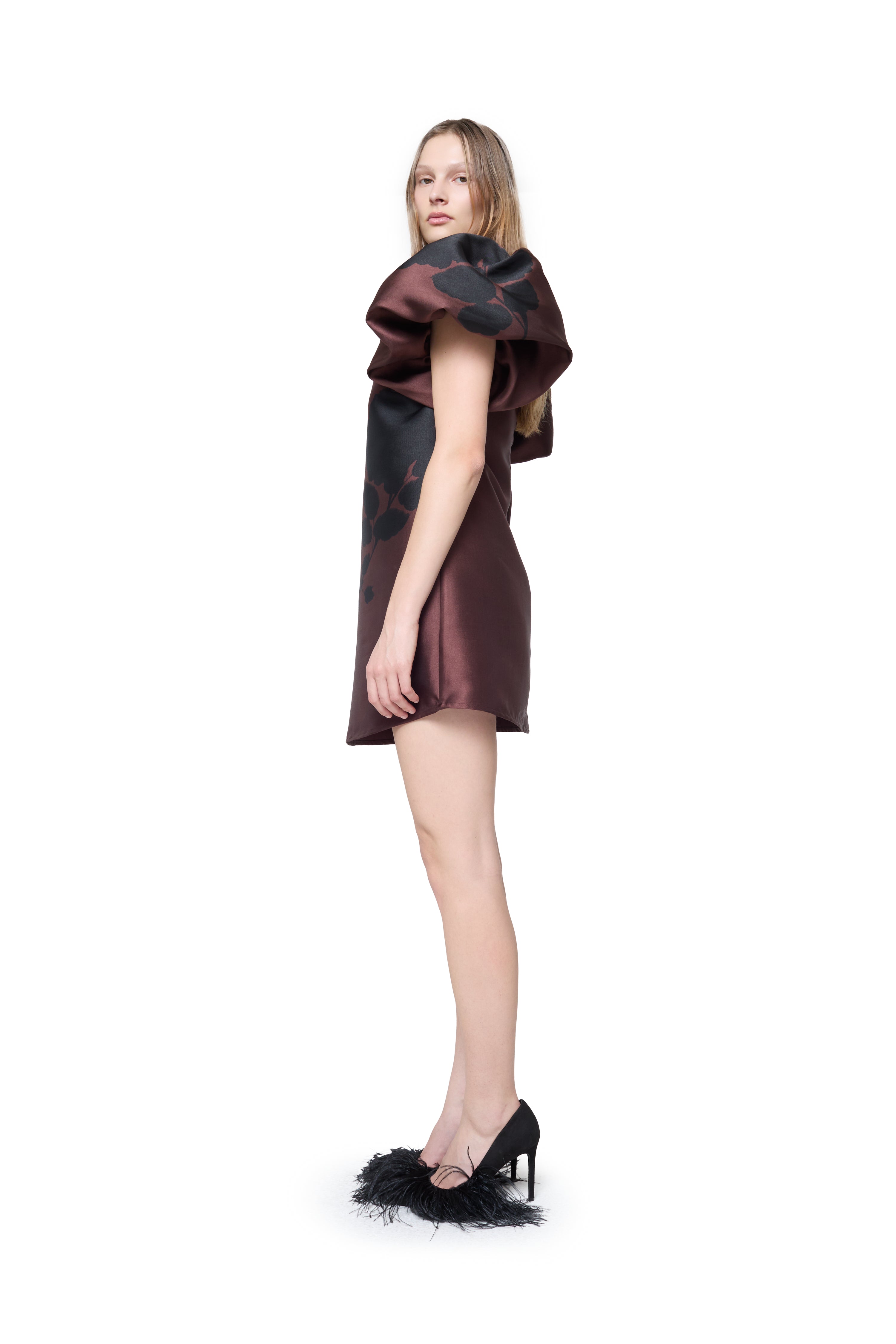 This mini-length brown printed dress is made from shiny mikado fabric and showcases bold balloon sleeves. Its sleek short silhouette is complemented by a stylish black floral brown pattern, perfect for transitioning effortlessly from day to night.