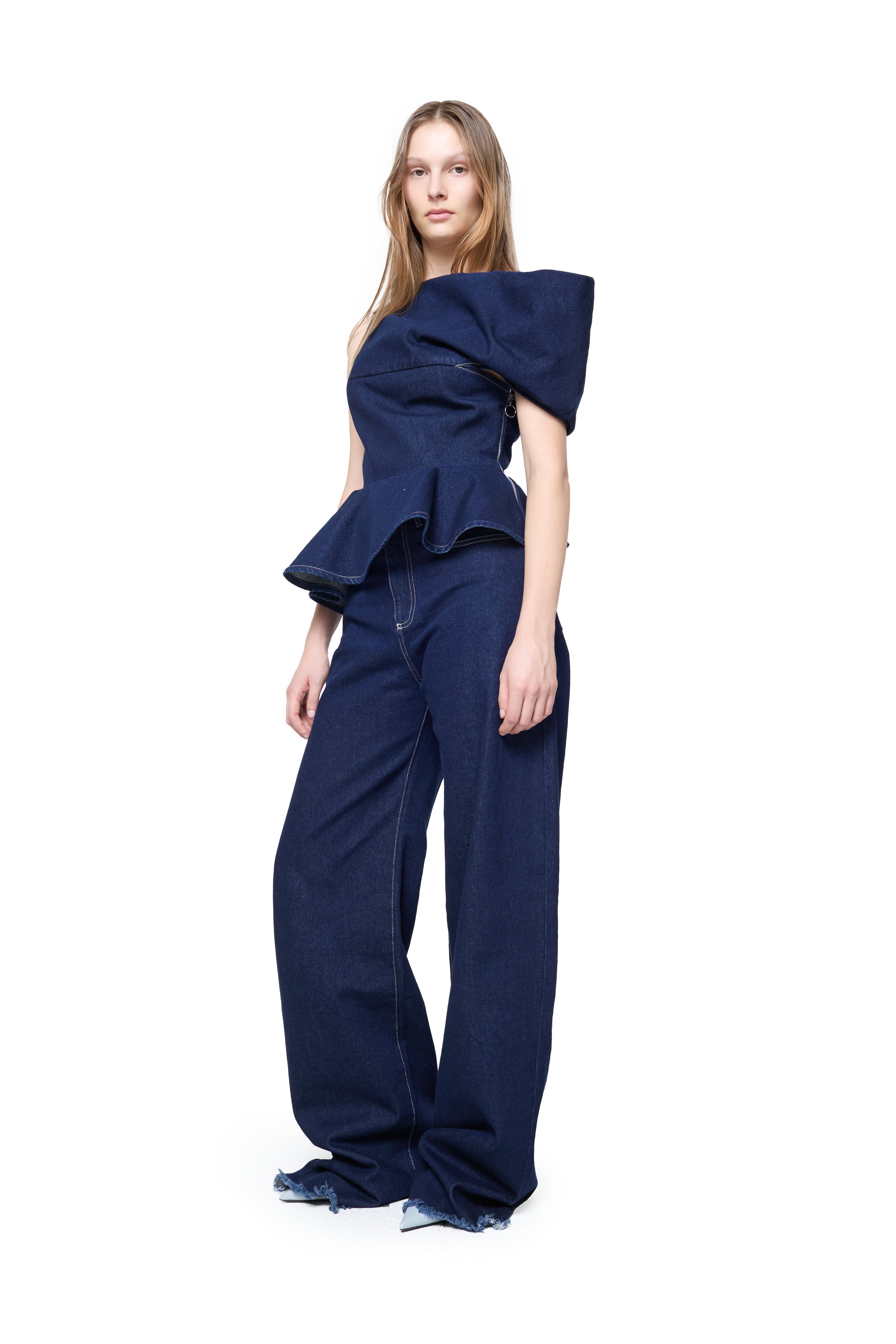 INDIGO DENIM OFF SHOULDER ASYMMETRIC TOP