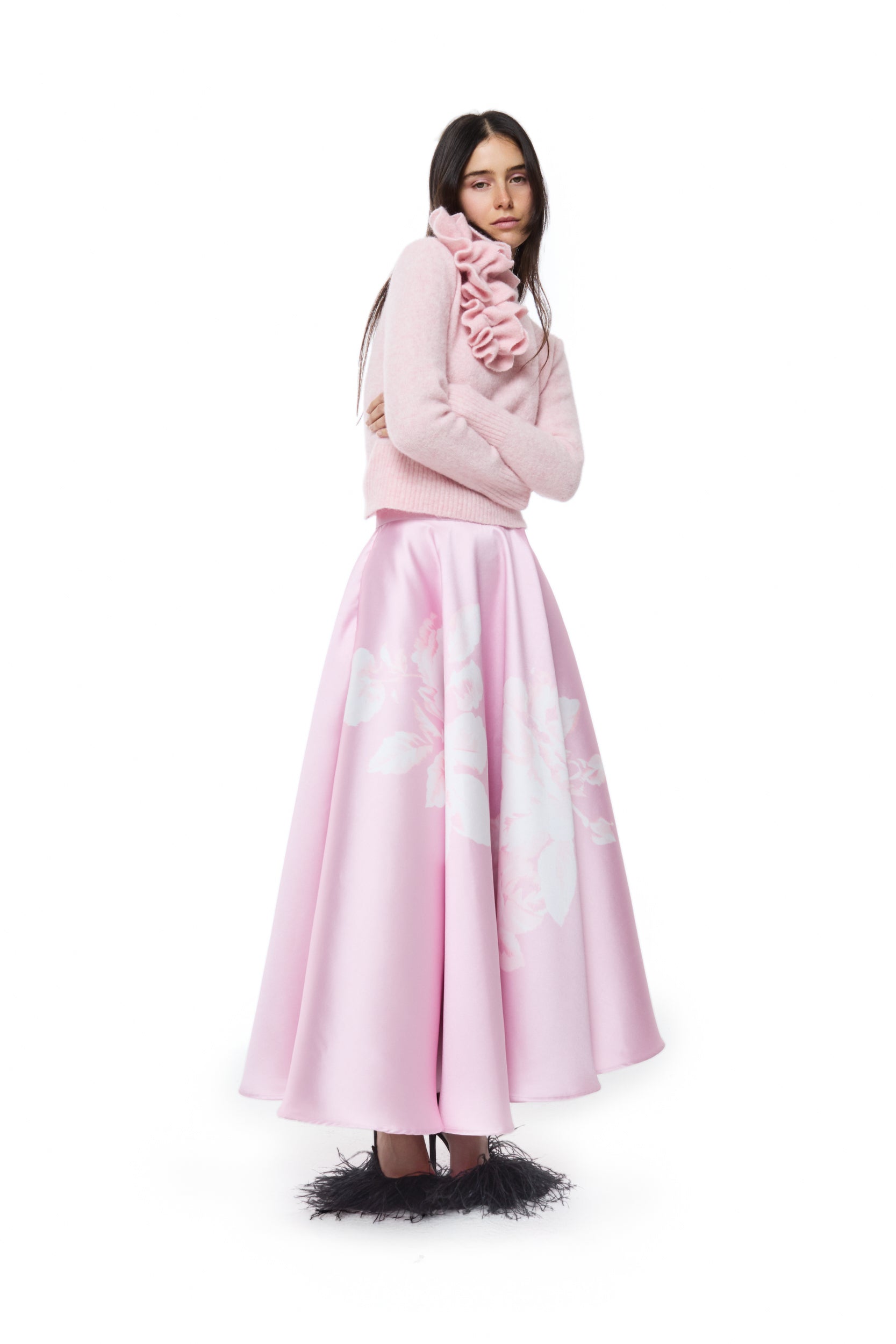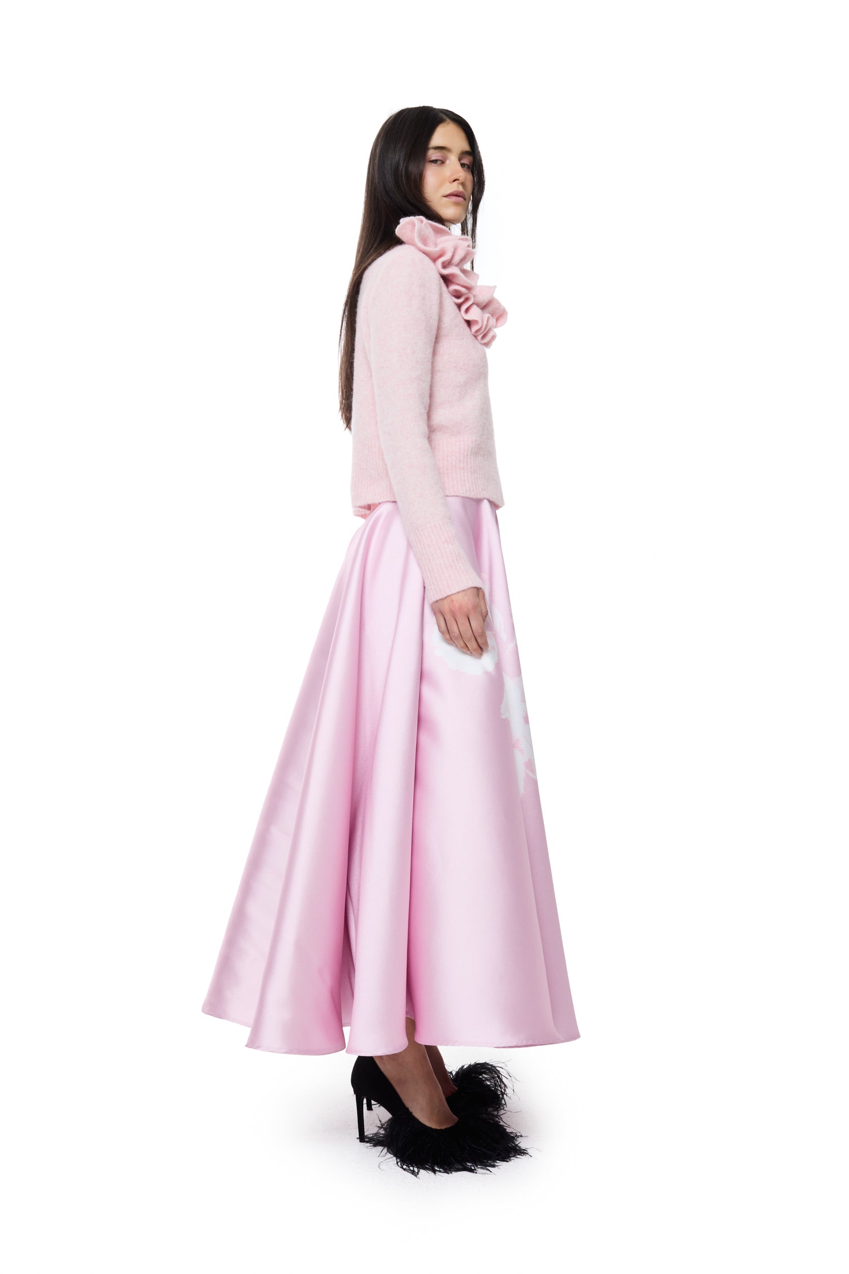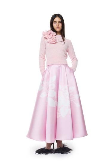 The Pink Printed Mikado High Waist Midi A-Line Skirt adds a touch of elegance with its structured silhouette. Crafted in lustrous mikado fabric, it features a flattering high waist and graceful midi length. The flower print brings a fresh, feminine finish perfect for any occasion.