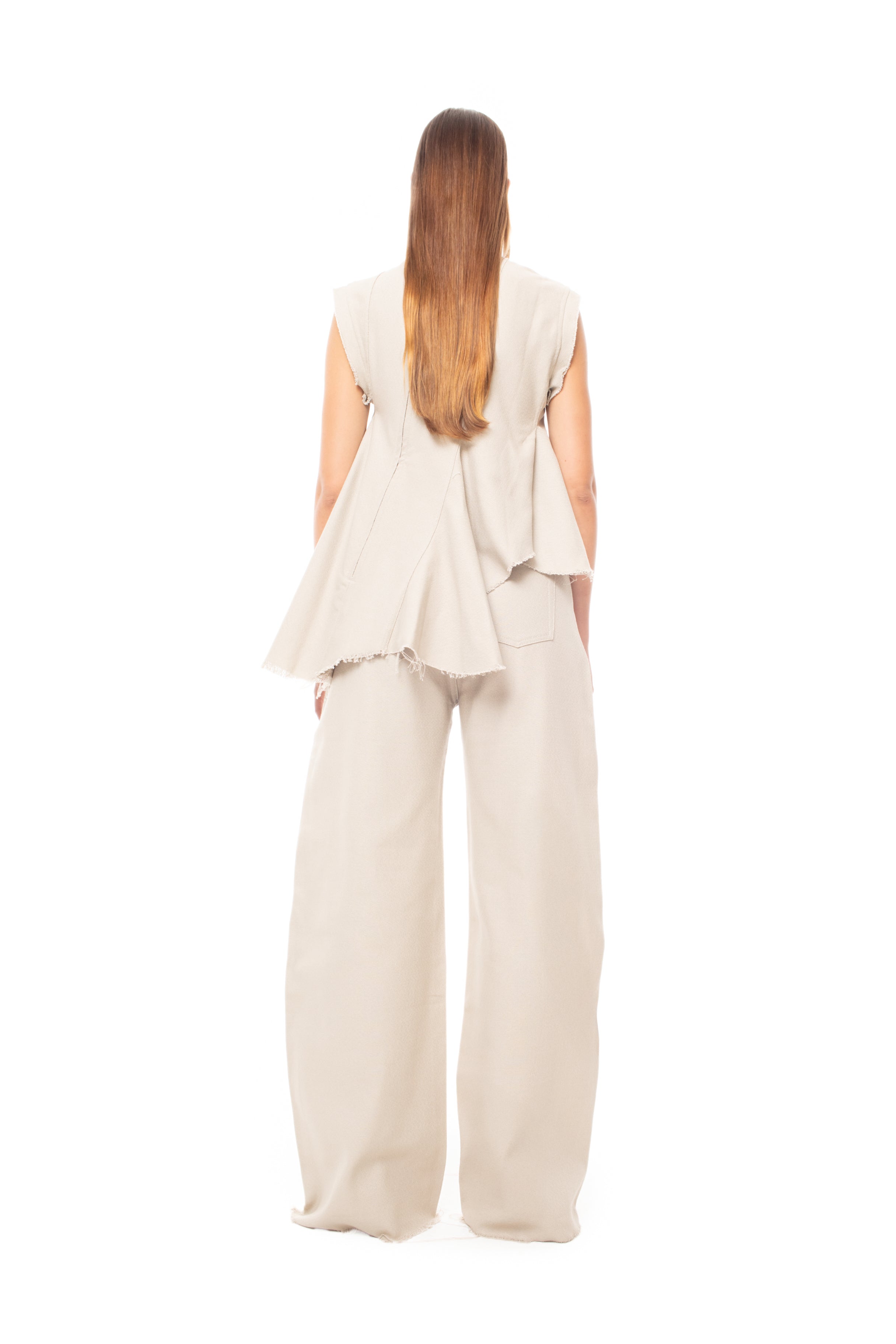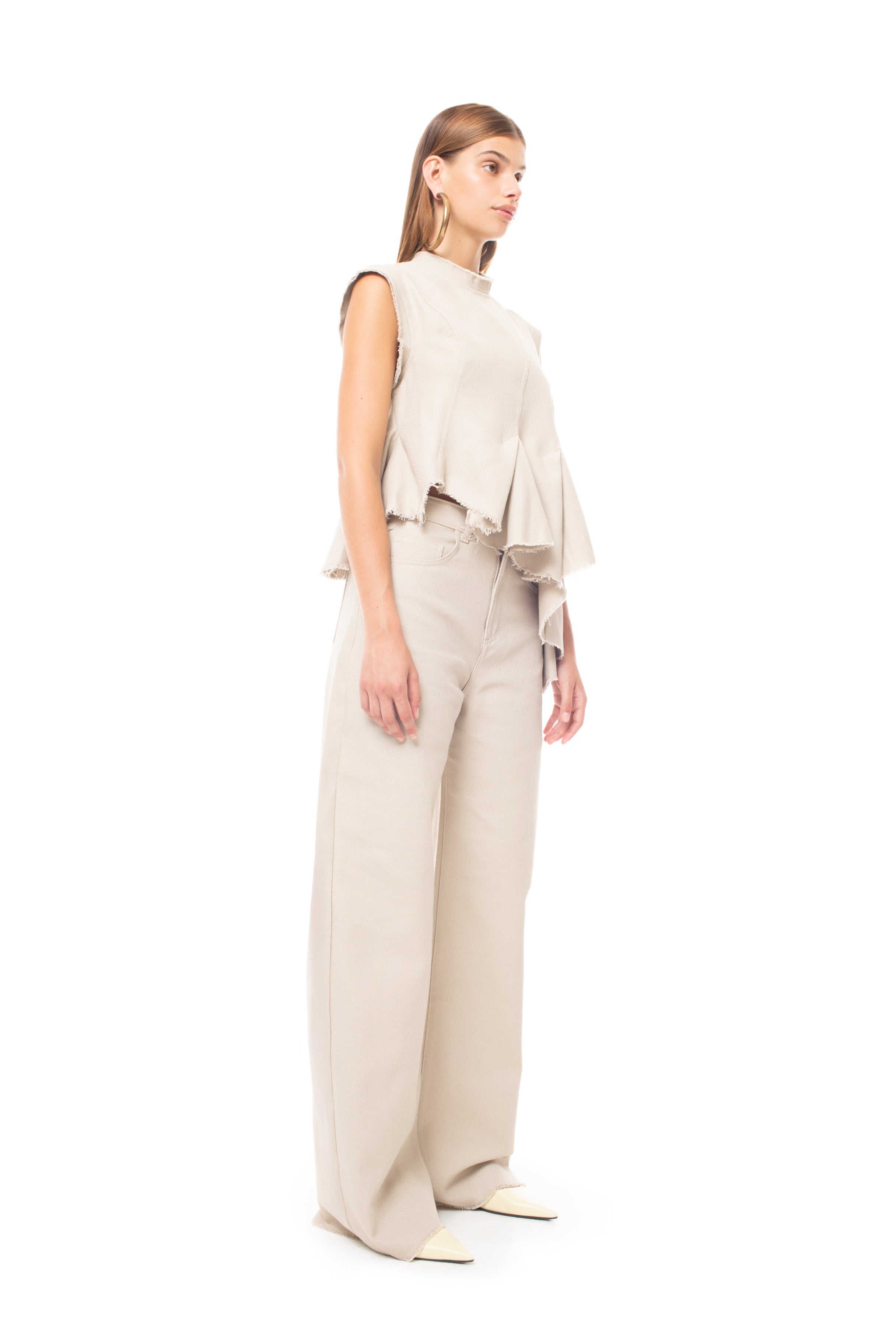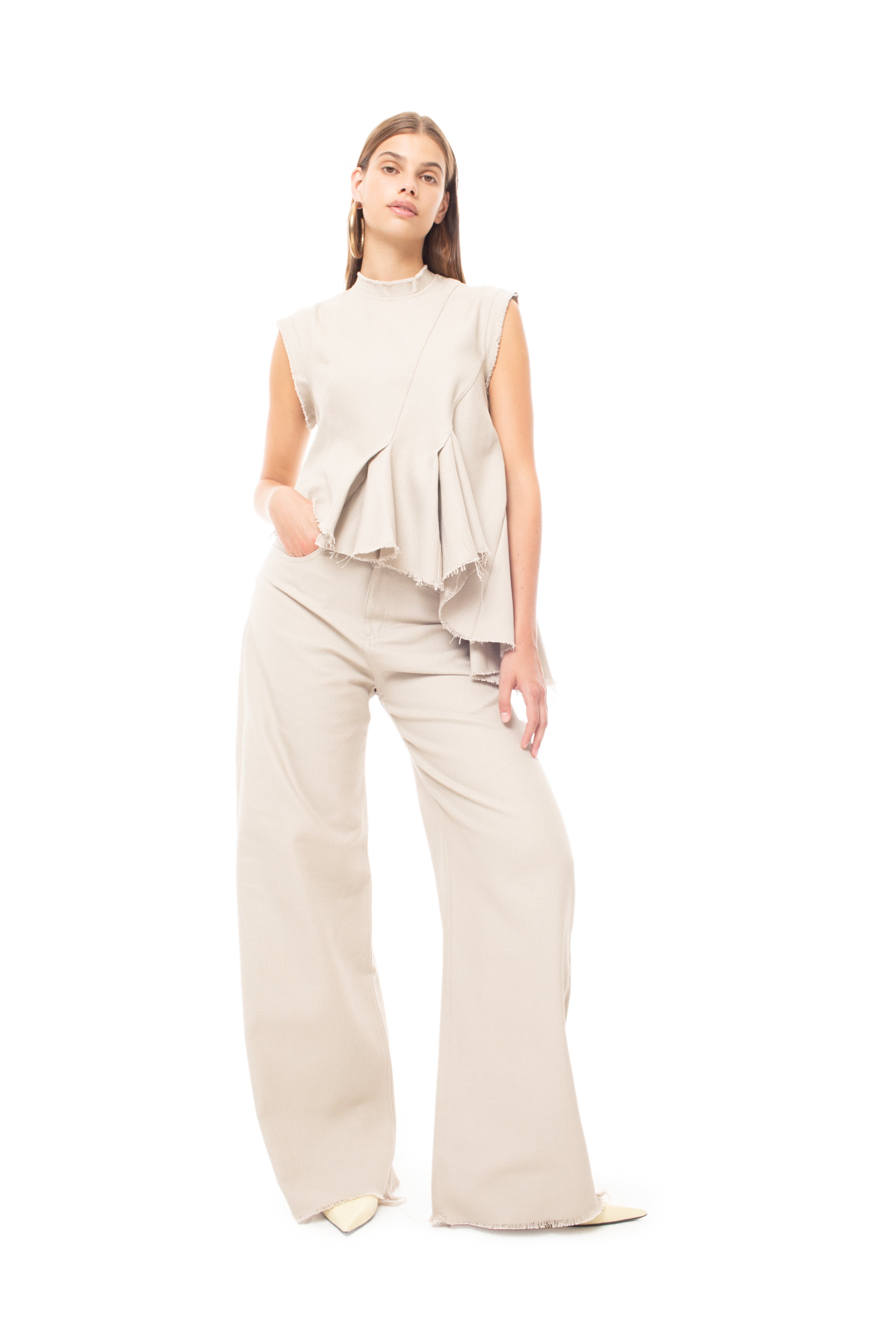 BEIGE WOVEN SLEEVELESS TOP WITH ASYMMETRIC HEM