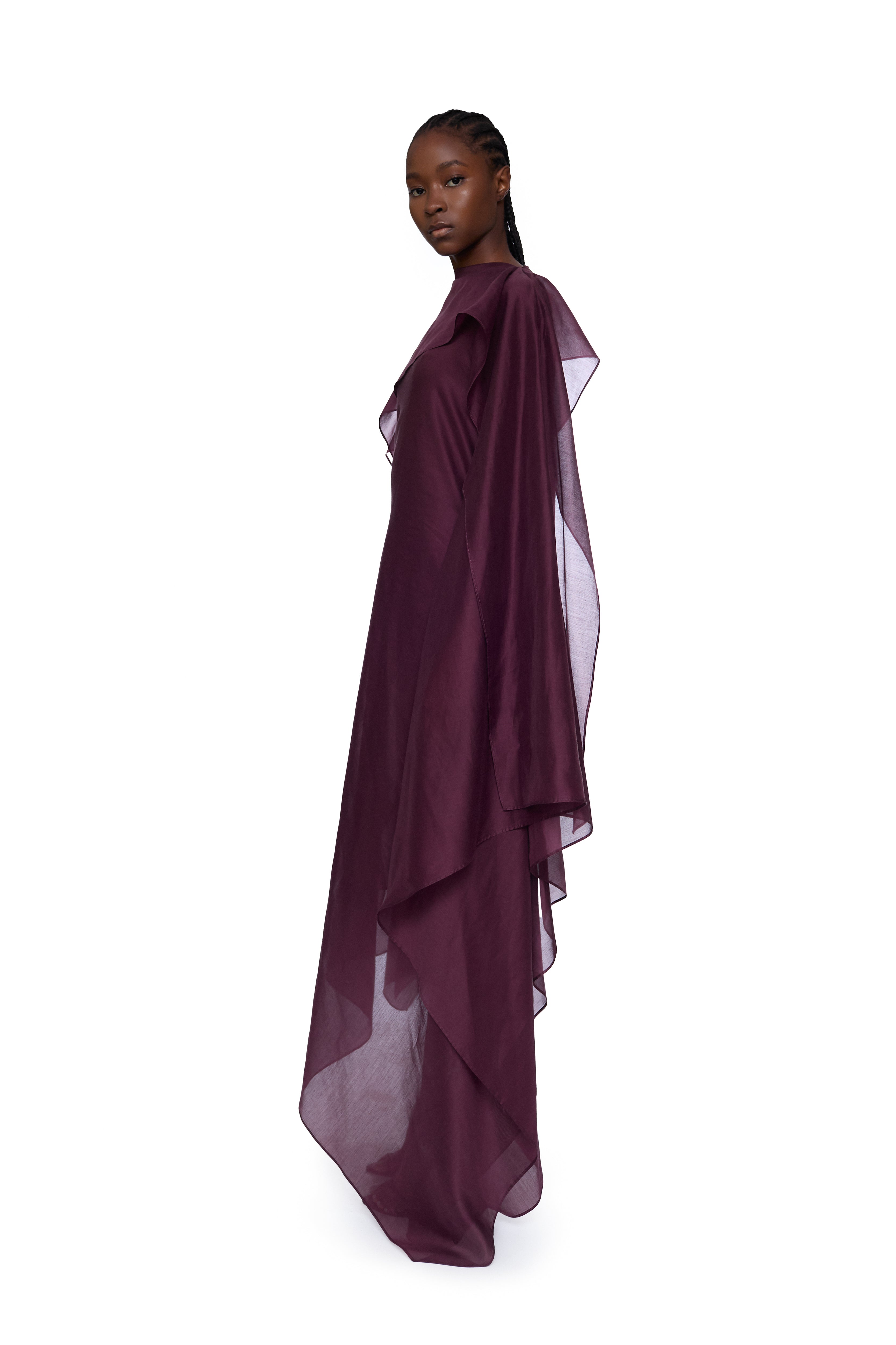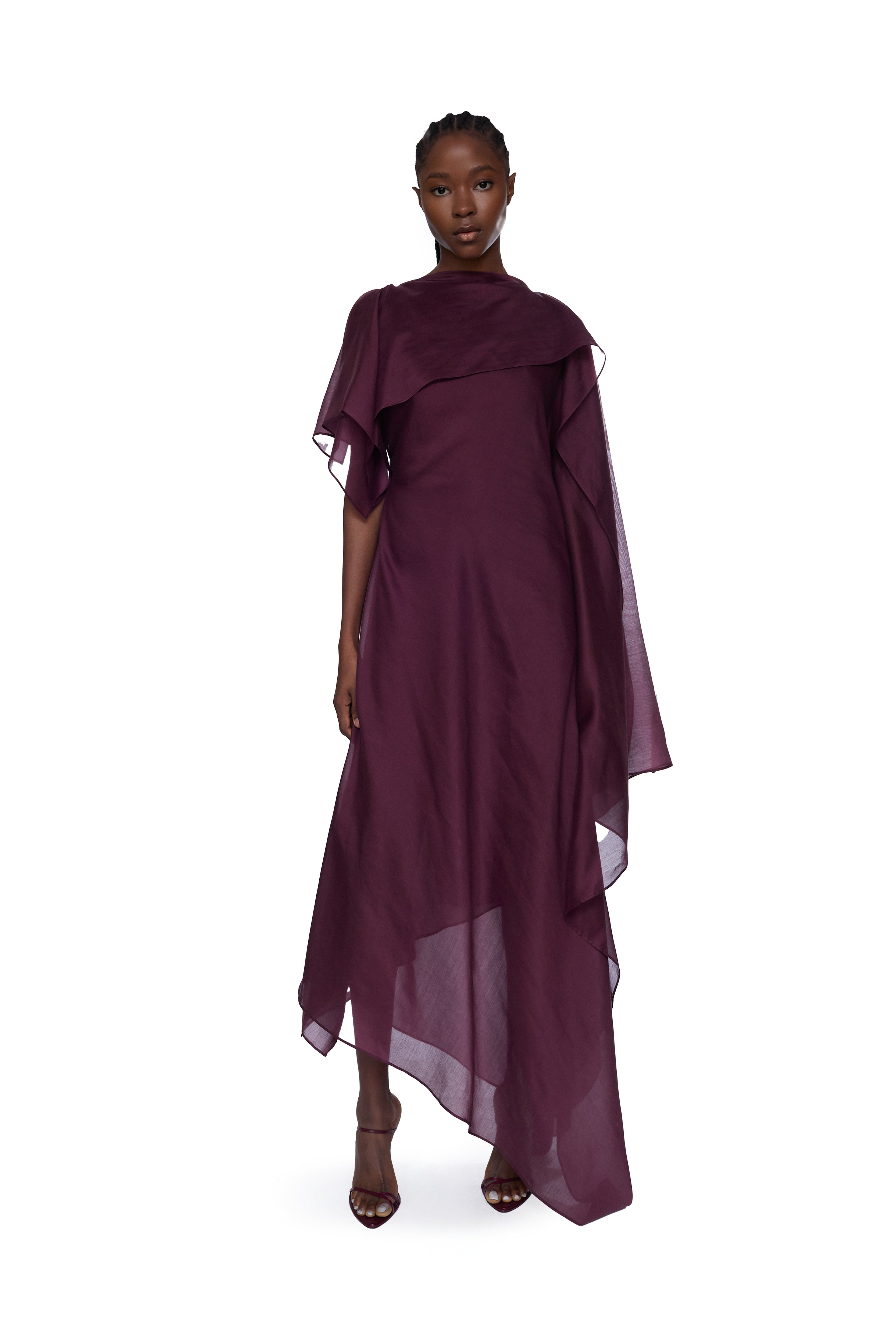 BURGUNDY SCARF DRAPE FLOWY MIDI DRESS
