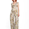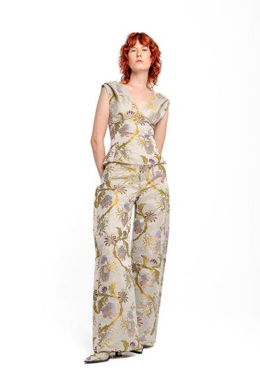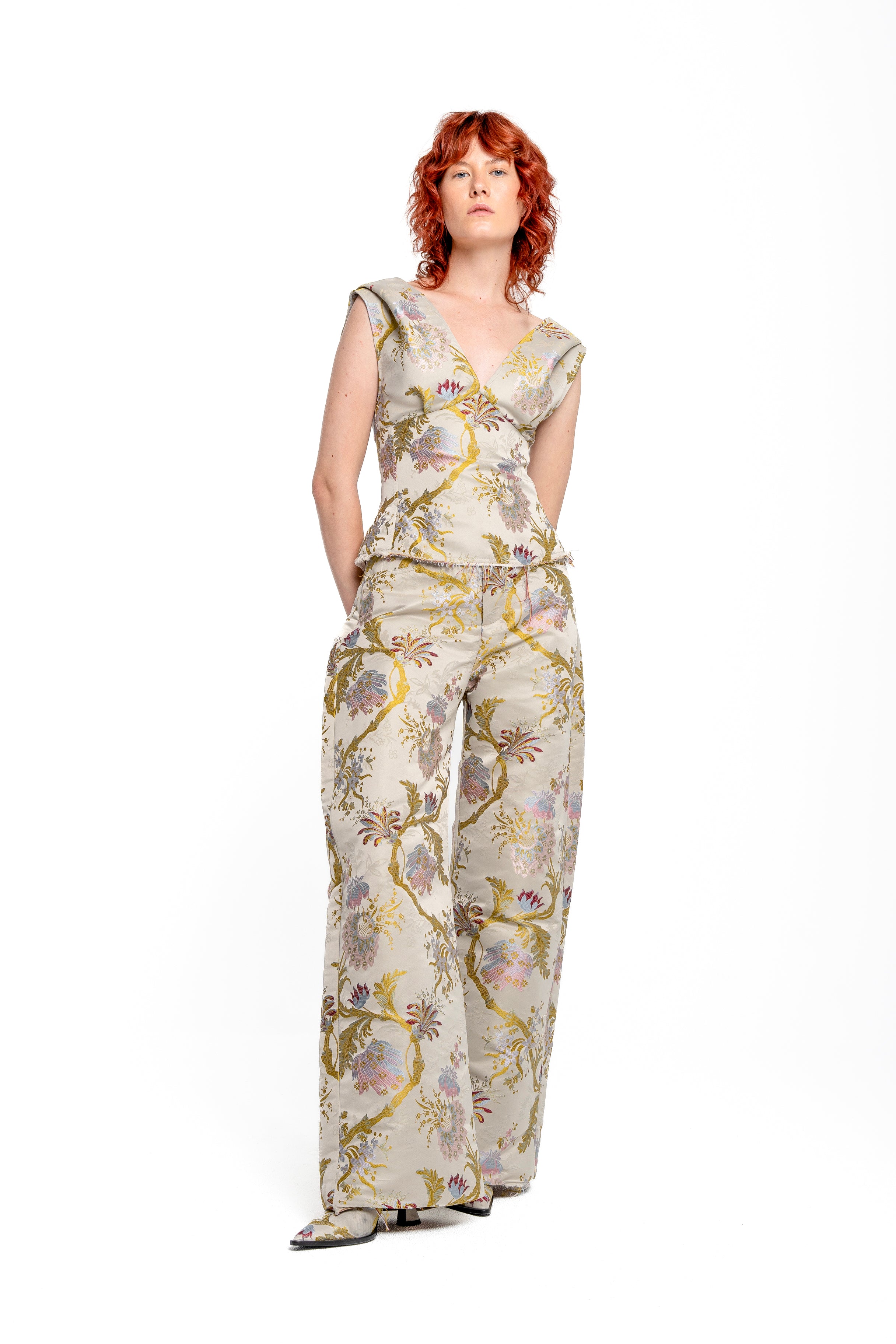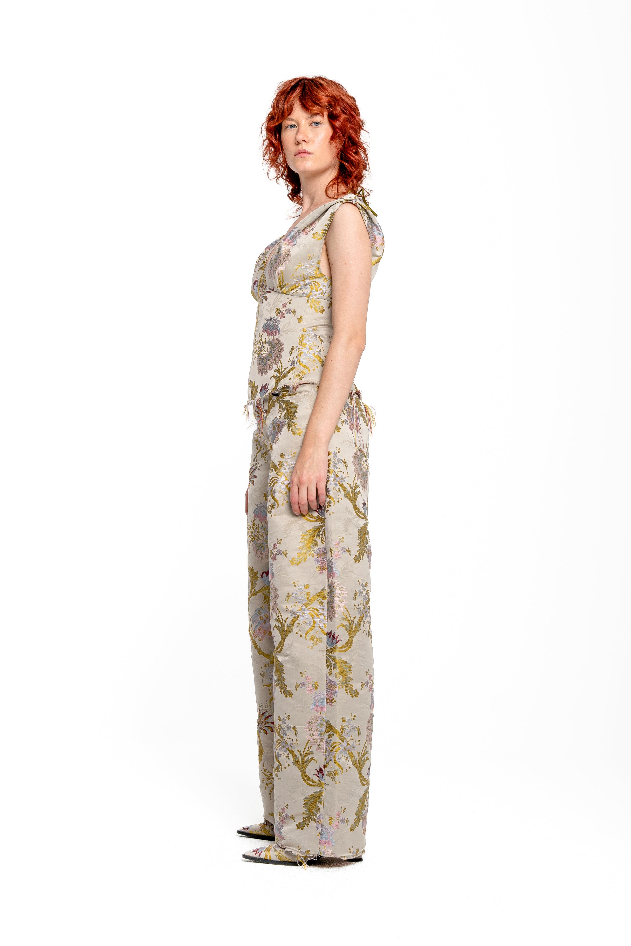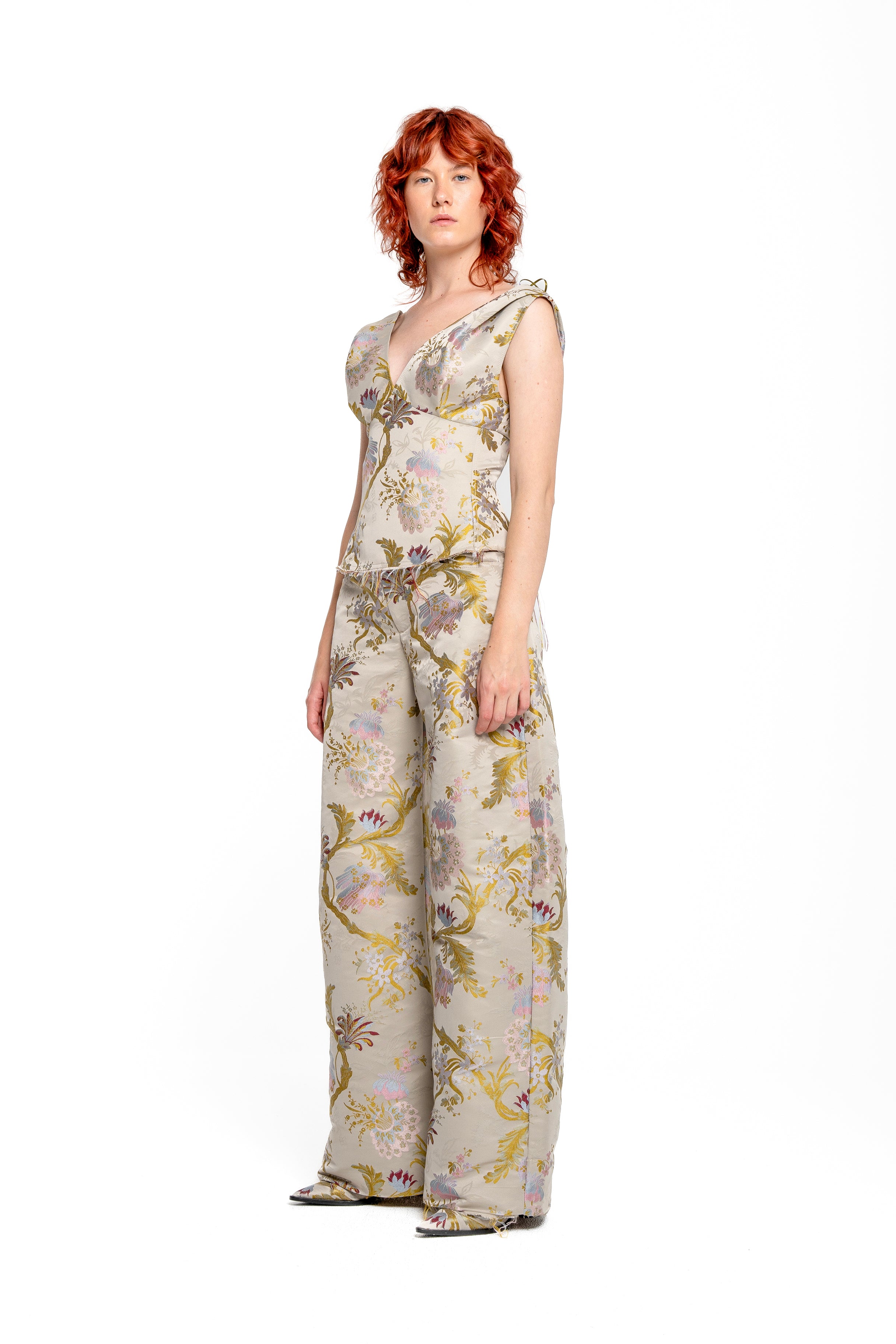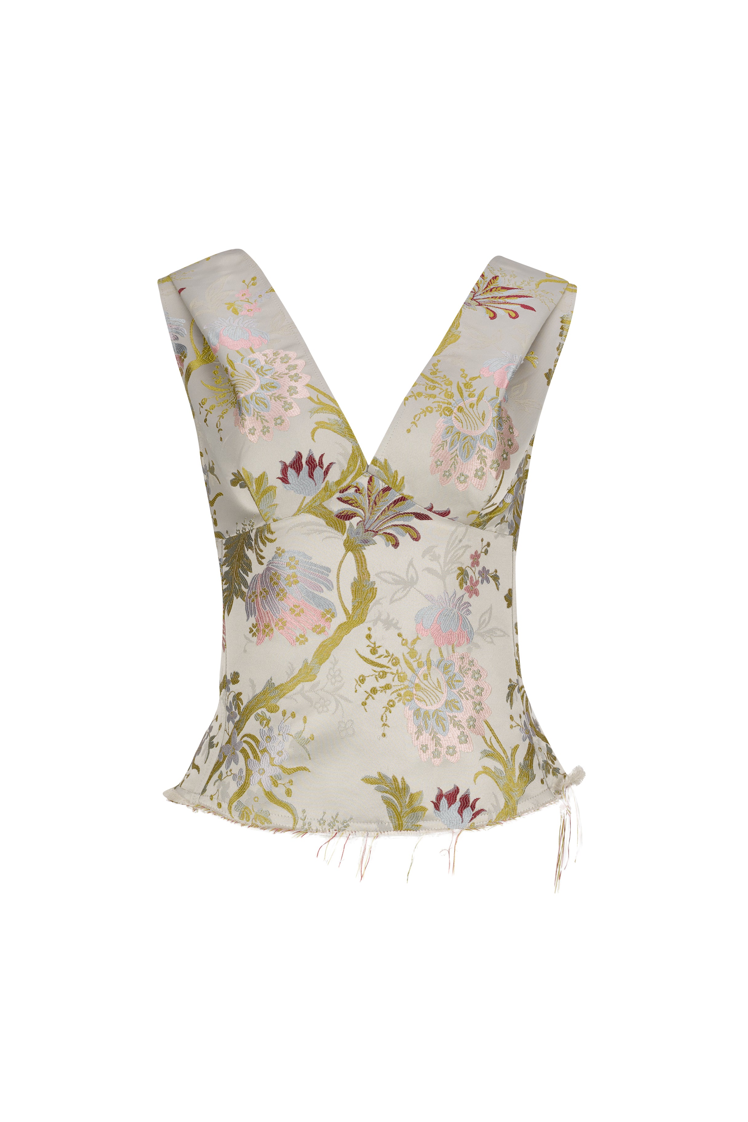 This grey satin brocade corset showcases a sleek fitted silhouette with an off-shoulder cut and a chic v-neckline. Its raw hem brings a subtle edge, making it an essential piece for elevating your style on any occasion.