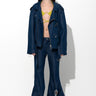 Navy bootcut deconstructed jeans feature a unique bootcut style, flared legs and frayed edges for a modern and edgy look.