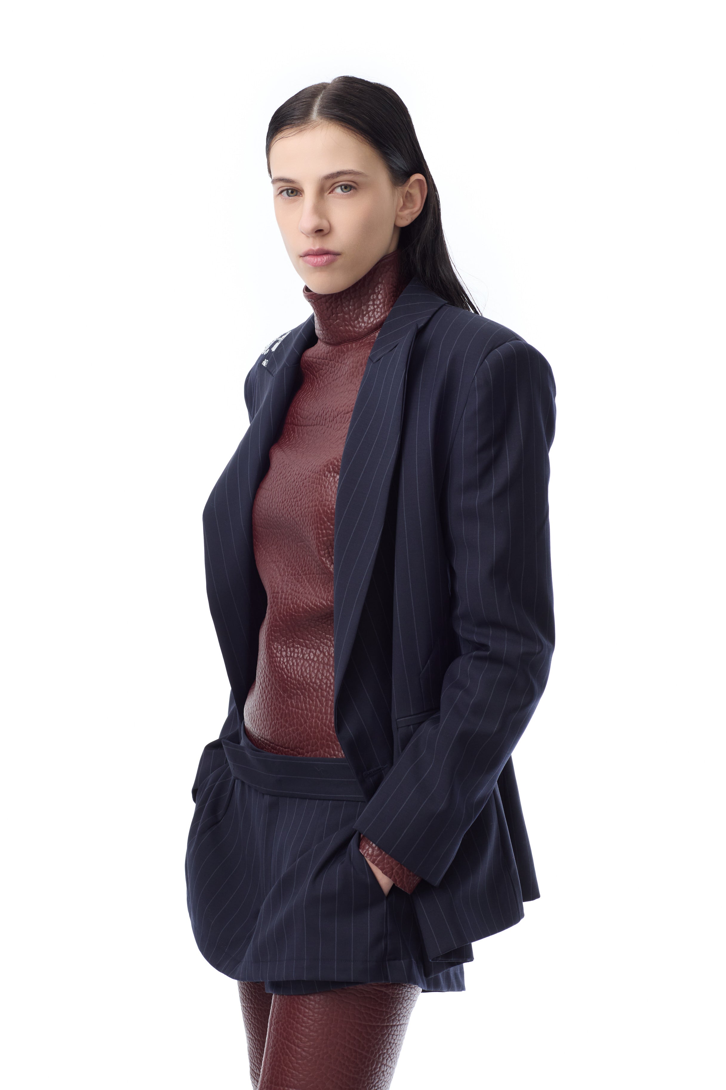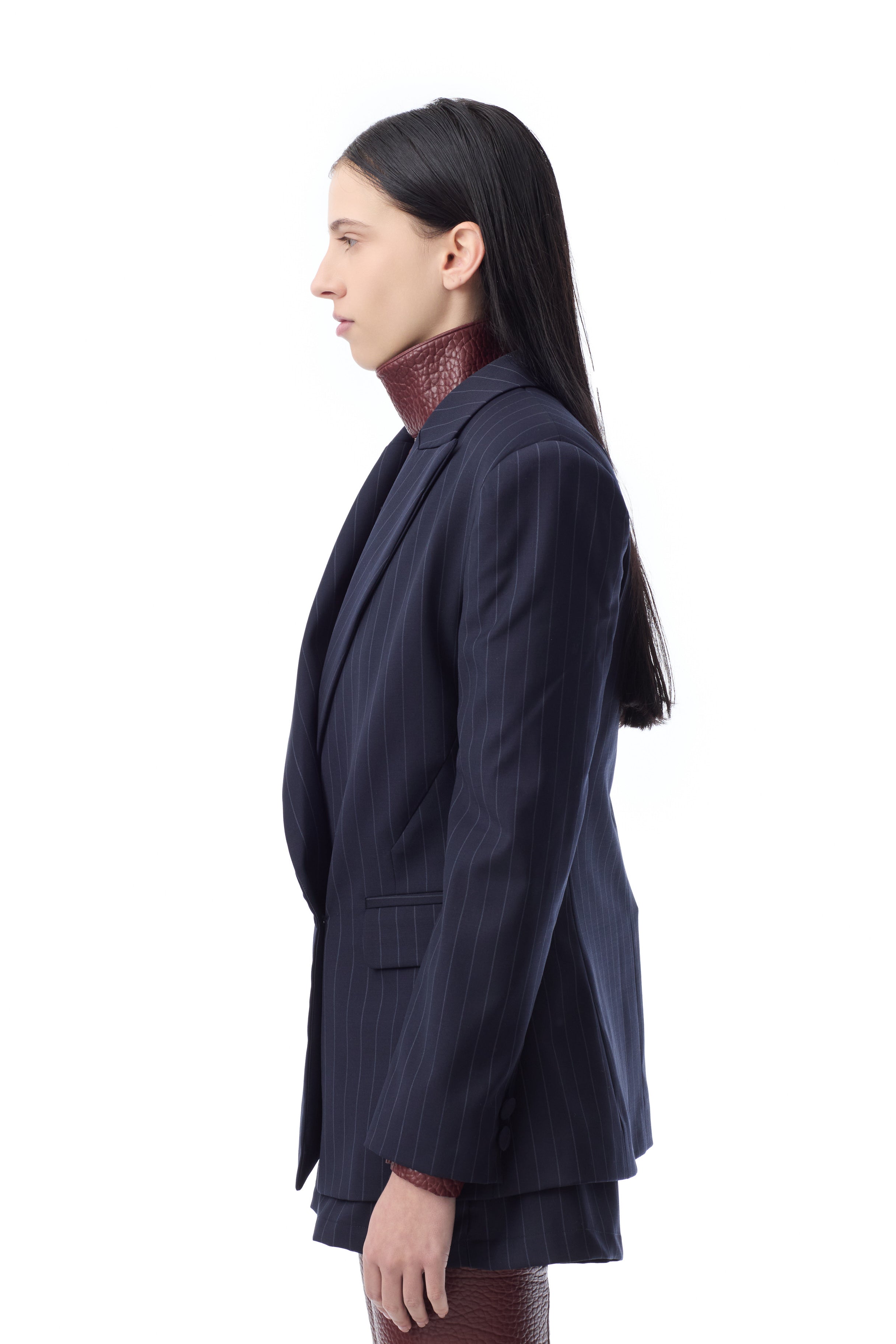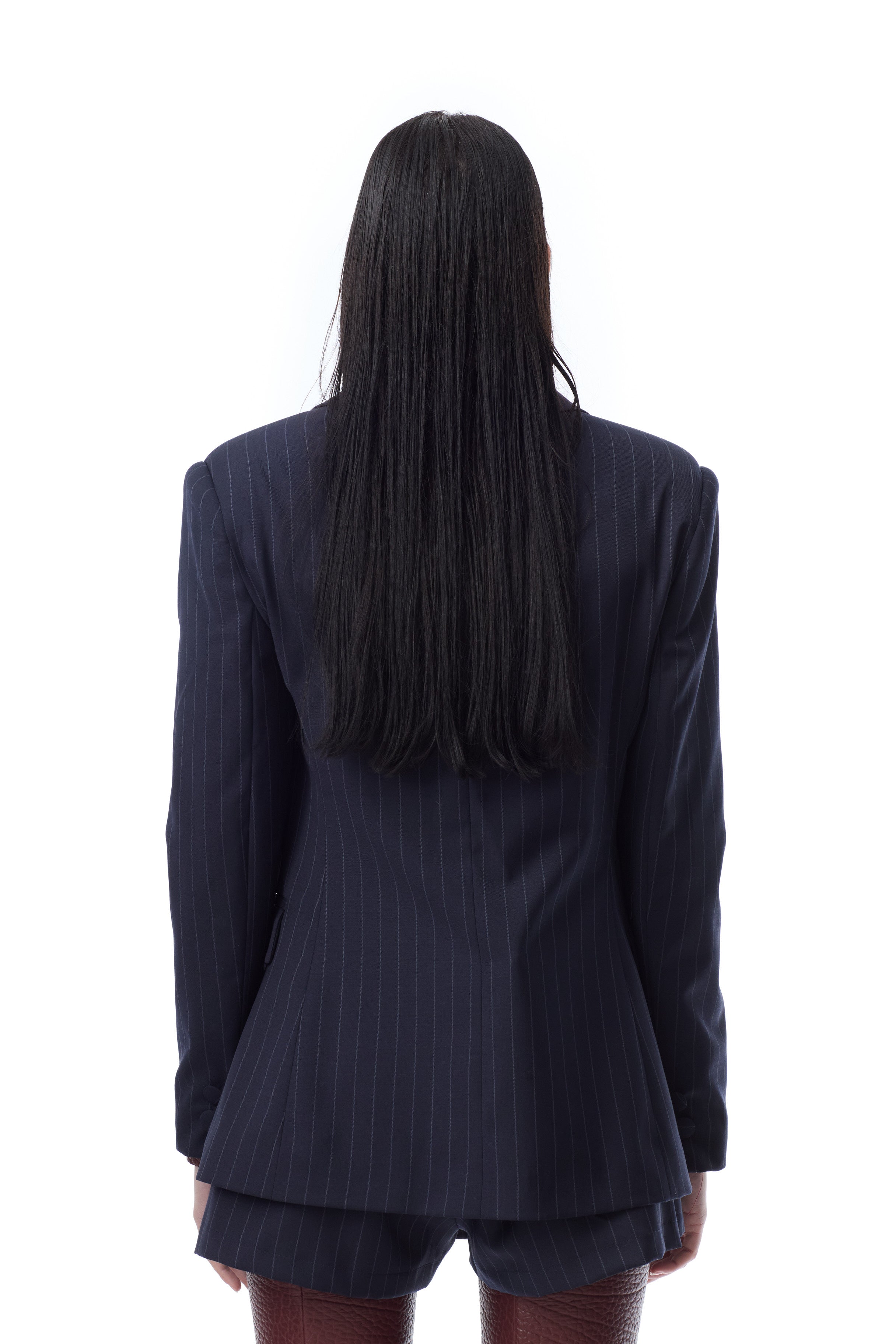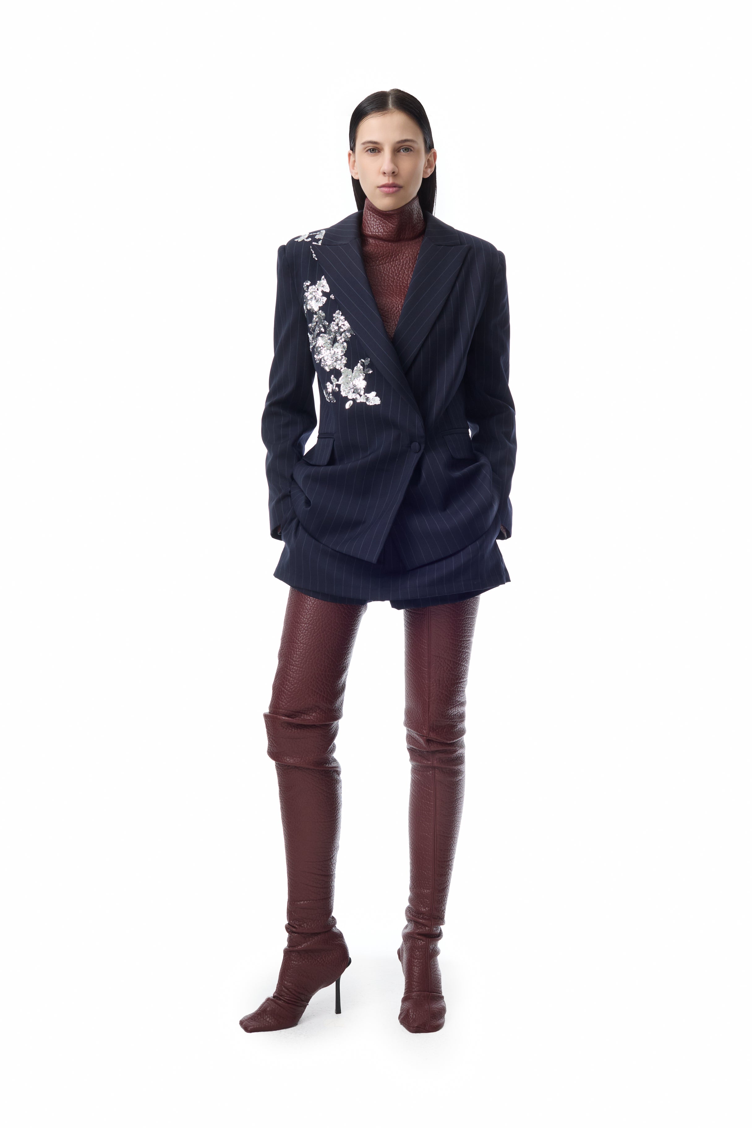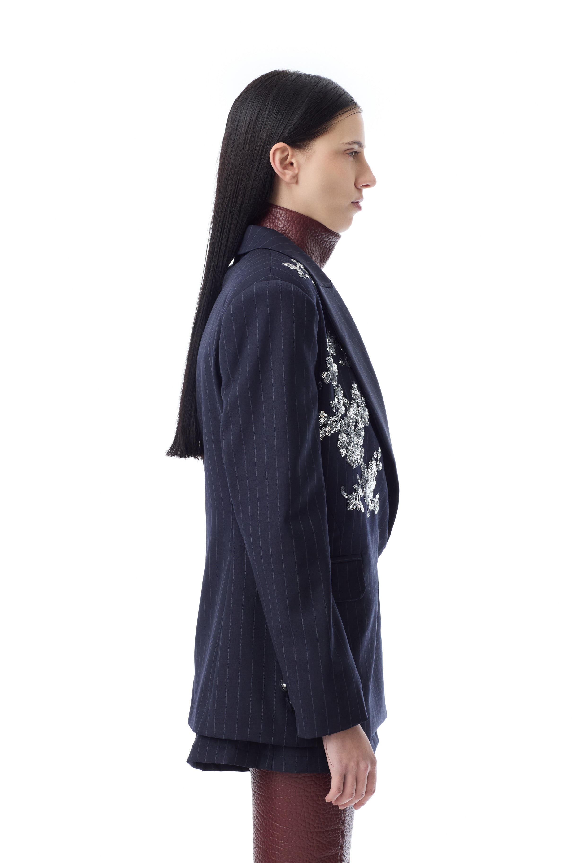 NAVY PINSTRIPE BLAZER WITH SEQUIN EMBROIDERY